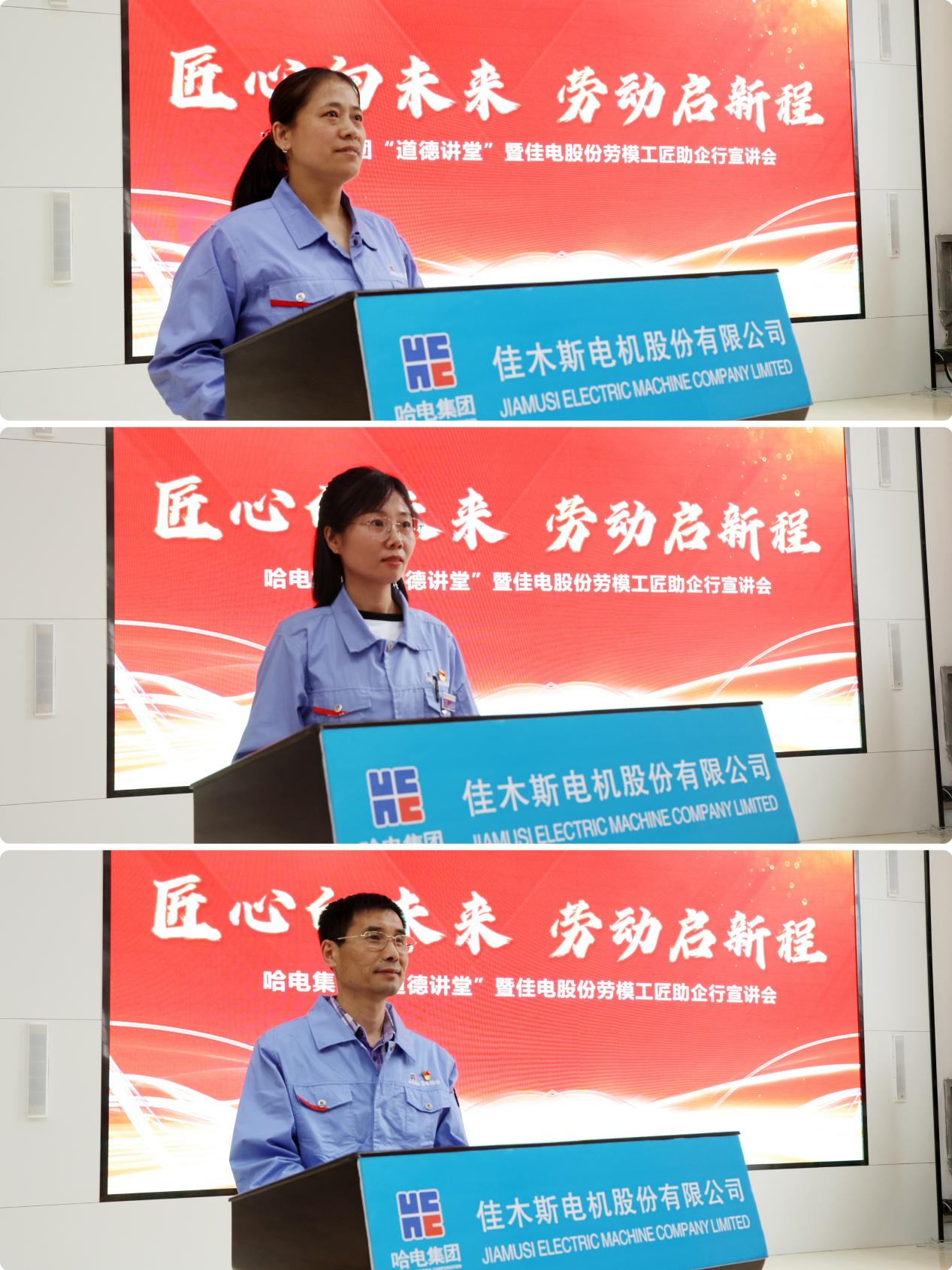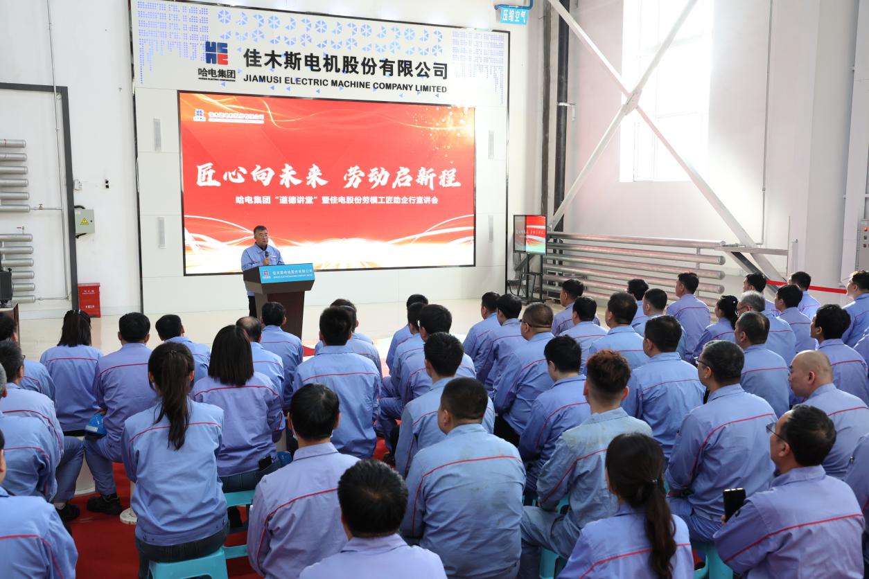 為深入貫徹落實(shí)習(xí)近平新時(shí)代中國(guó)特色社會(huì)主義思想,落實(shí)集團(tuán)公司“道德講堂”工作部署,圍繞公司“積跬步 成千里 向未來”工作安排,大力弘揚(yáng)“勞模精神、勞動(dòng)精神、工匠精神”,在公司范圍內(nèi)積極營(yíng)造“勞動(dòng)光榮、創(chuàng)造偉大”的時(shí)代新風(fēng)尚,5月24日,哈電集團(tuán)佳木斯電機(jī)股份有限公司(以下簡(jiǎn)稱“佳電股份”)在高壓電機(jī)數(shù)字化裝配車間,組織召開首次“匠心向未來,勞動(dòng)啟新程”為主題的哈電集團(tuán)“道德講堂”暨佳電股份勞模工匠助企行宣講會(huì)。佳電股份黨委副書記、工會(huì)主席劉亨出席會(huì)議并講話。