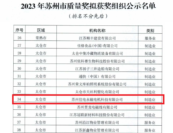 近日,蘇州市質(zhì)量獎(jiǎng)評(píng)定委員會(huì)公示2023年蘇州市質(zhì)量獎(jiǎng)評(píng)定結(jié)果,蘇州佳電永磁電機(jī)科技有限公司(以下簡(jiǎn)稱“蘇州佳電”)憑借著在戰(zhàn)略規(guī)劃、核心技術(shù)構(gòu)建、經(jīng)營(yíng)理念、質(zhì)量體系等方面的優(yōu)秀表現(xiàn),經(jīng)過(guò)層層嚴(yán)格評(píng)審,得到了質(zhì)量評(píng)定委員會(huì)的高度認(rèn)可,獲評(píng)“蘇州市質(zhì)量獎(jiǎng)”榮譽(yù)稱號(hào)。